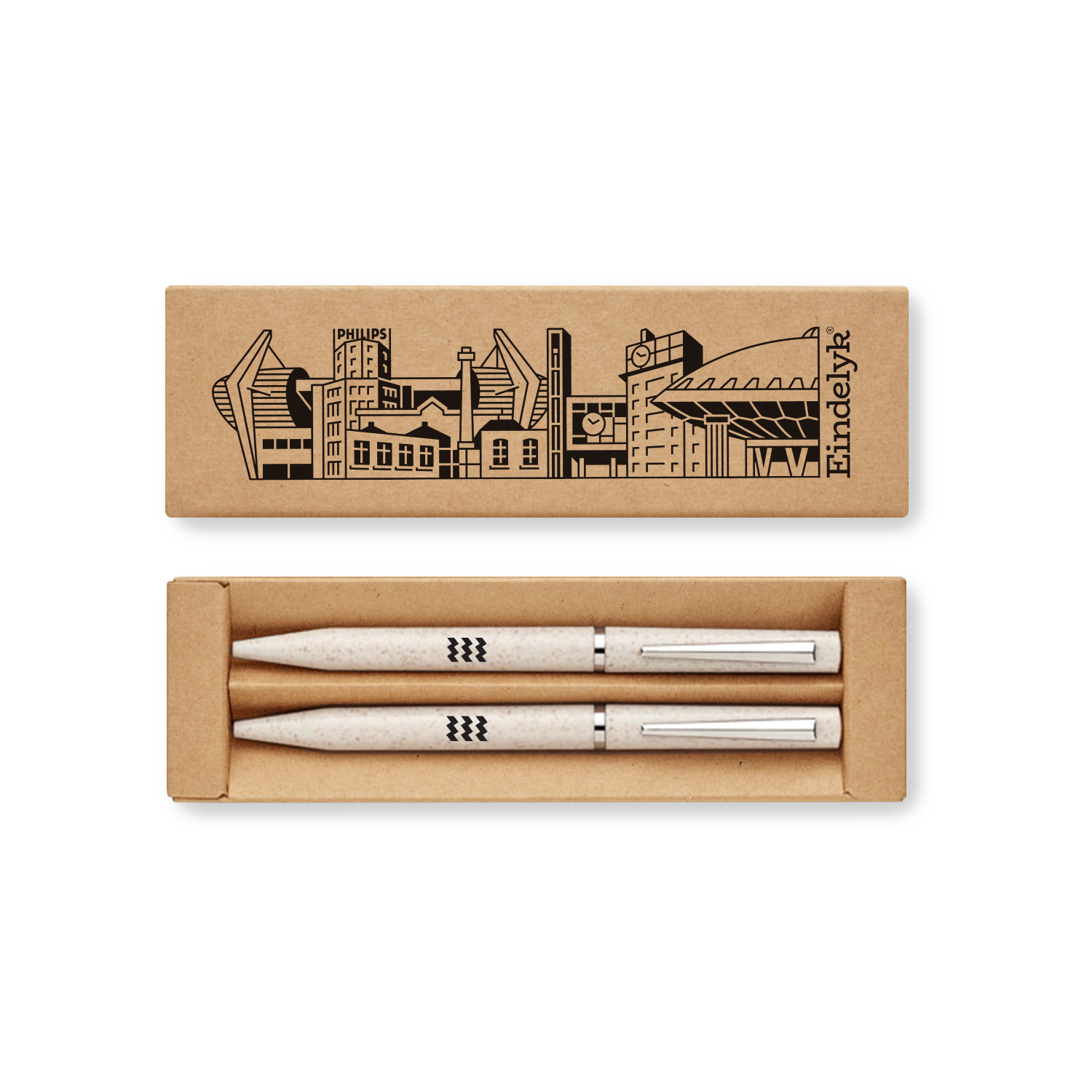 Set met 1 draaibalpen blauwschrijvend en 1 draaibalpen grafiet inktloos. Verpakt in een gerecycled doosje met Eindhoven zeefdruk.